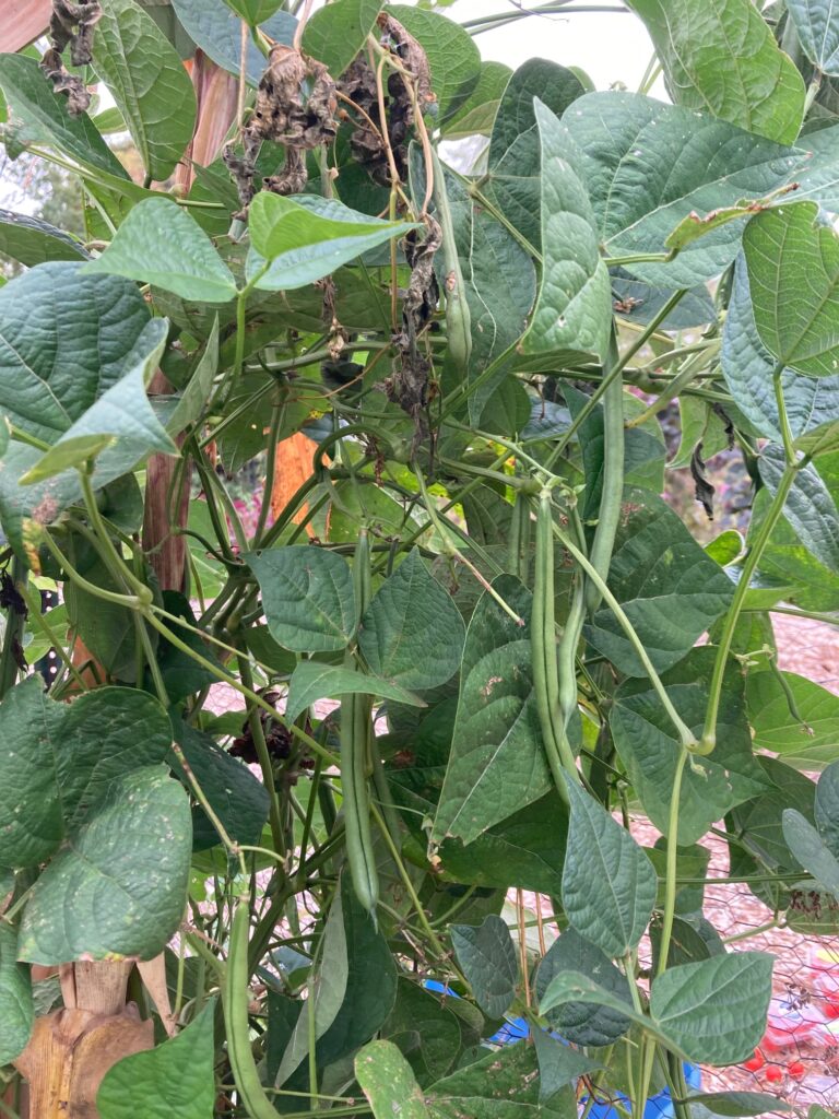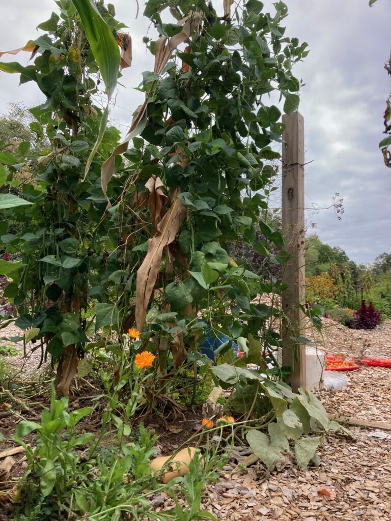 ‘Seychelles’ pole beans readily wrapped themselves up and around our cornstalks, climbing well to the top and spilling over and back down the stalks, and the yield and bean quality was phenomenal! At the time of this writing (October 6), bean production has slowed down, but the vines are still yielding well.